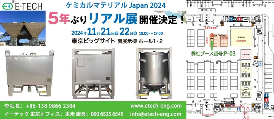 ケミカルマテリアルジャパン2024 投稿日 2024年4月30日 更新日 2025年4月30日 著者 admin_etech カテゴリー news ケミカルマテリアルジャパンは、幅広い化学企業および関連業界が一堂に会する国内最大級の総合展示会です。 展示会は、先端化学材料展、化学物質管理会議、プロセス産業DX展、産業安全フォーラムで構成されます。 当社は主に、各種ステンレス製ibcタンク、スクリューコンベアなどの設計、開発、品質管理を専門としています。 私たちのブースへようこそ!